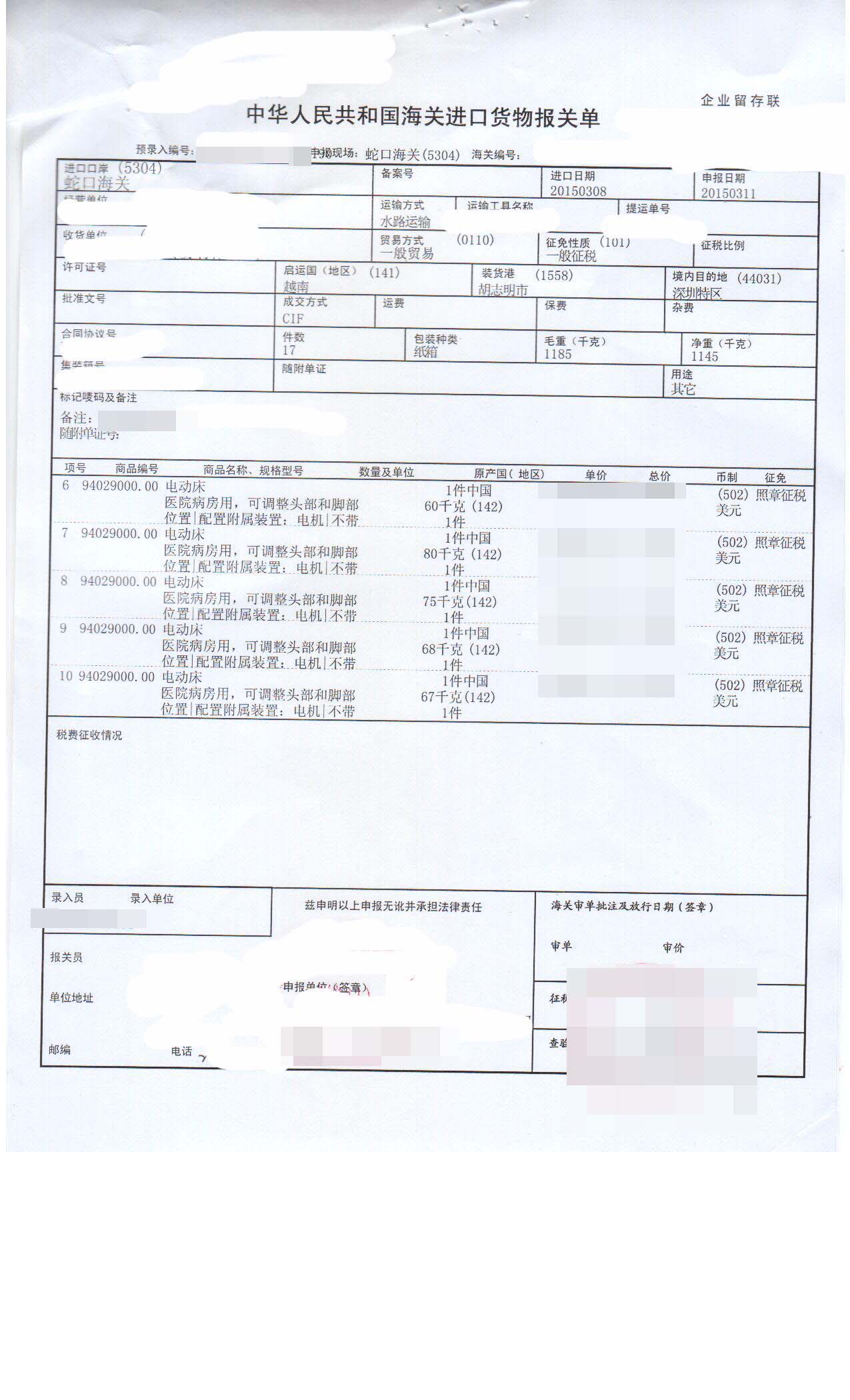 三、電動(dòng)床進(jìn)口報(bào)關(guān)案例展示